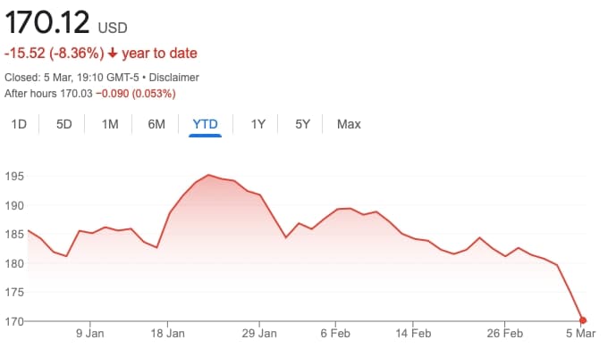 Η τιμή της μετοχής της Apple σημειώνει πτώση τις τελευταίες εβδομάδες, φθάνοντας σήμερα στο χαμηλότερο επίπεδο του έτους, κλείνοντας στα 170,12 δολάρια.