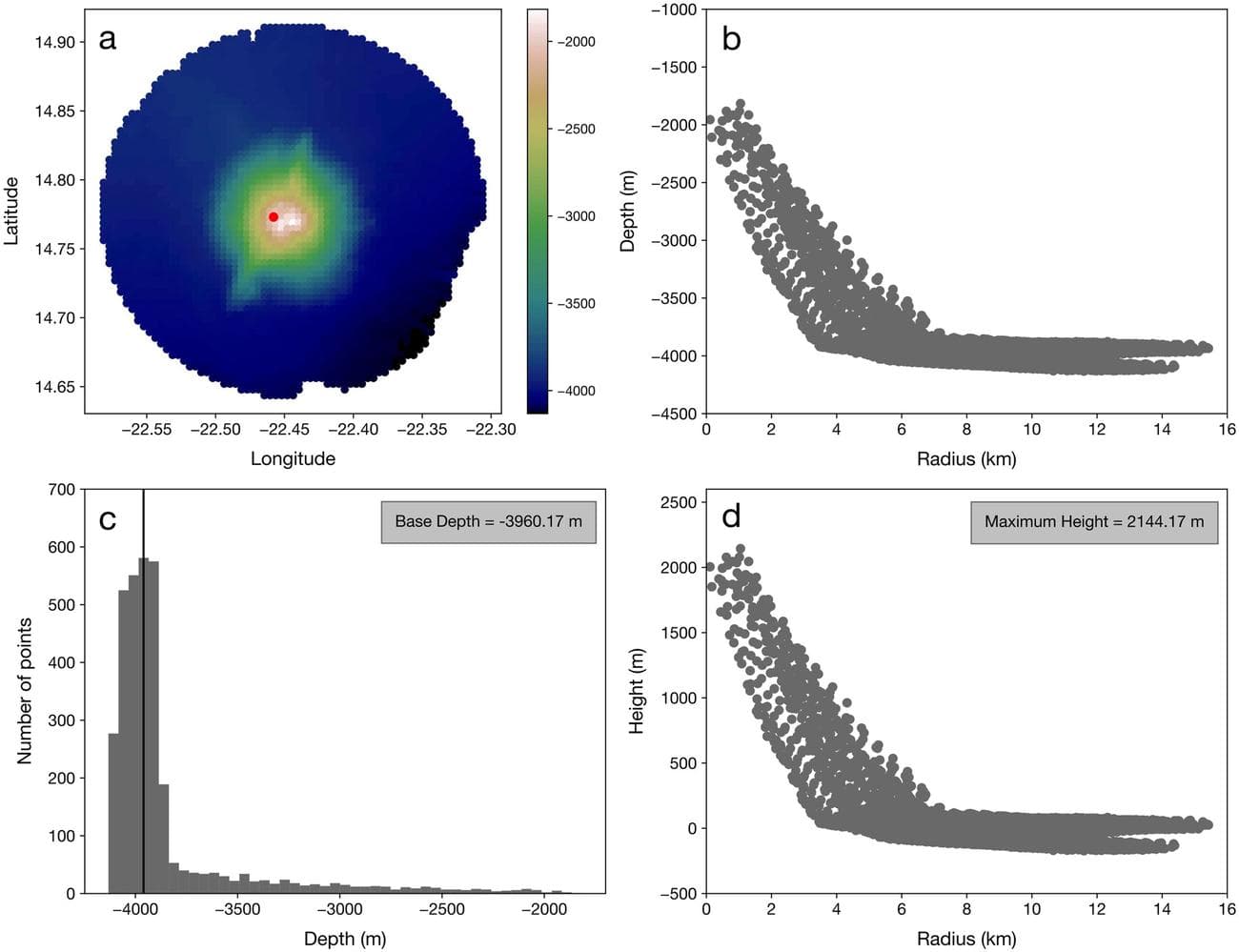 Το μικρότερο ηφαίστειο που εντοπίστηκε είχε ύψος 421 μέτρων. Τα περισσότερα ήταν ψηλότερα από 700 μέτρα και αρκετά ξεπερνούσαν τα 2.500 μέτρα από τον πυθμένα του ωκεανού.