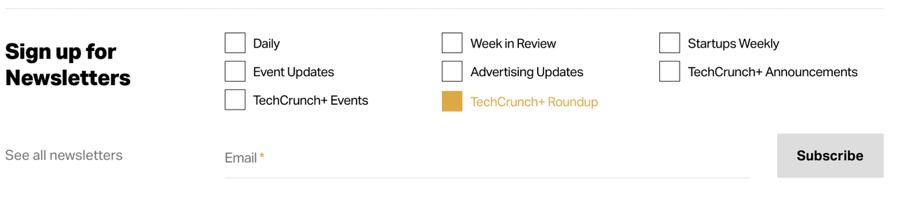 Για να λαμβάνετε το TechCrunch+ Roundup ως email κάθε Τρίτη και Παρασκευή, κάντε κύλιση προς τα κάτω για να βρείτε την ενότητα «εγγραφή για ενημερωτικά δελτία» σε αυτήν τη σελίδα, επιλέξτε «TechCrunch+ Roundup», εισαγάγετε το email σας και κάντε κλικ στην «εγγραφή».