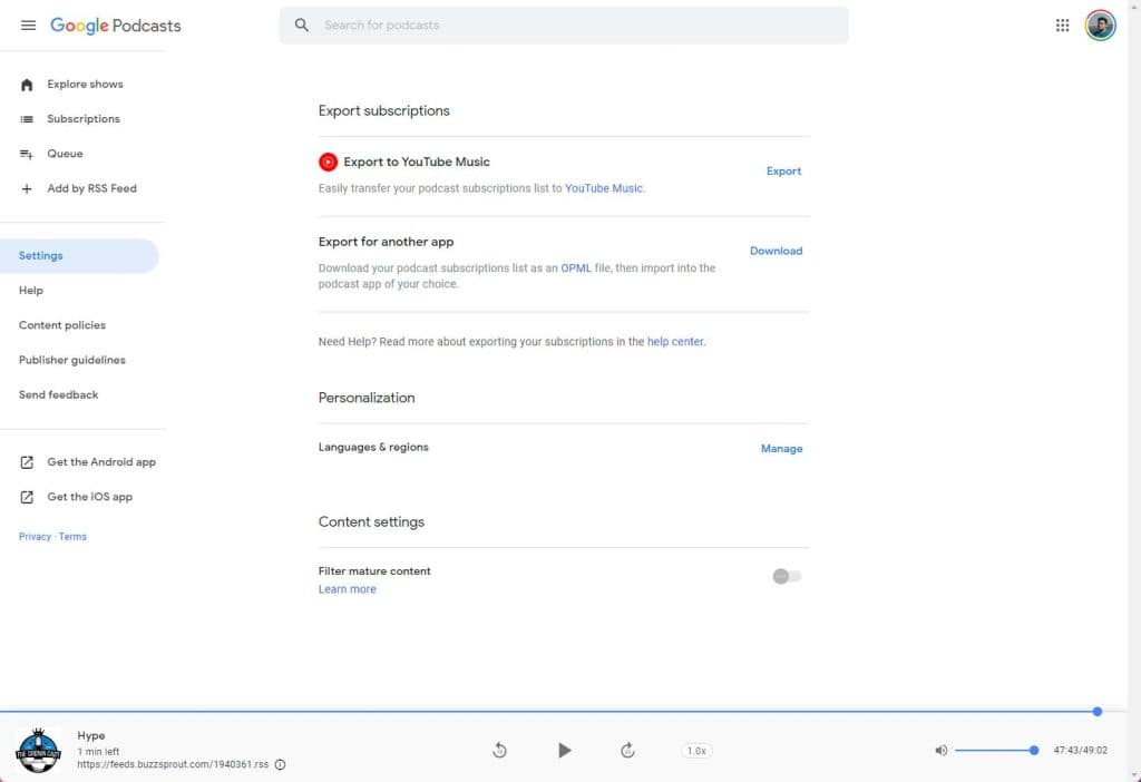 Το Google Podcasts προσφέρει επίσης μια δευτερεύουσα λύση για την εξαγωγή συνδρομών. Οι χρήστες μπορούν να κατεβάσουν ένα αρχείο OPML που άλλες εφαρμογές podcast θα μπορούν να εισαγάγουν, φέρνοντας τις συνδρομές τους με μια γρήγορη κίνηση. Δεν είναι σαφές εάν όλες οι εφαρμογές podcast και οι ιστότοποι εκεί έξω θα δέχονται ένα αρχείο OPML για εισαγωγή, αλλά αυτές θα είναι οι μόνες σας δύο επιλογές πέρα από τη μη αυτόματη εγγραφή σε κάθε καλλιτέχνη podcast στη βιβλιοθήκη σας.