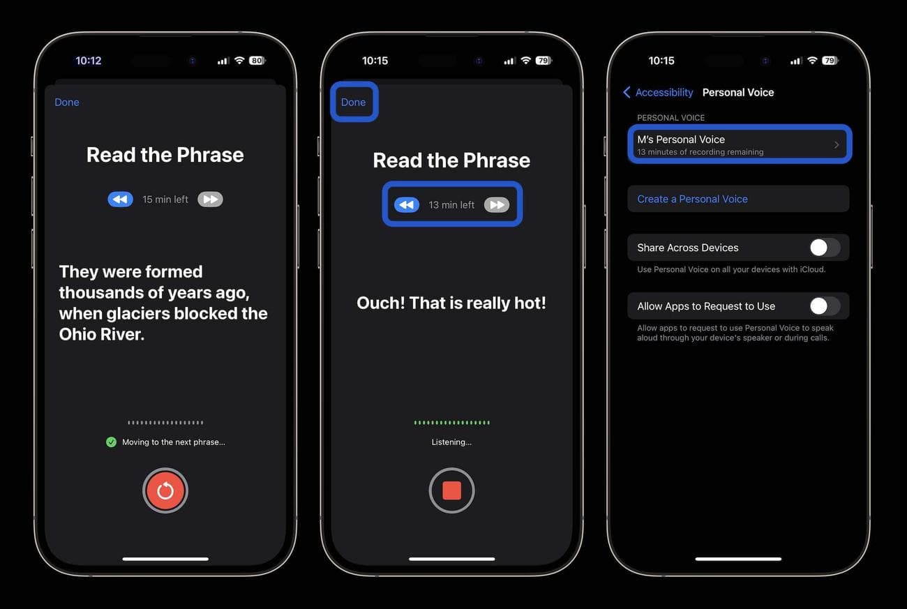 Με το Personal Voice στο iPhone, θα διαβάσετε μια σειρά από τυχαίες προτάσεις. Χρειάζονται συνολικά 15 λεπτά από εσάς να μιλήσετε – η Apple σημειώνει ότι μπορεί να χρειαστεί «περίπου μία ώρα» για να ολοκληρωθεί η όλη διαδικασία.