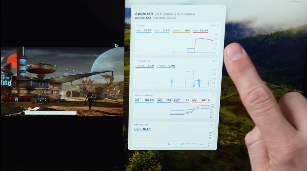 Κάπως έτσι, το M3 MacBook Air συνεχίζει να κολλάει, ακόμη και με την υψηλότερη θερμοκρασία CPU να φτάνει τους 114 βαθμούς Κελσίου και τη GPU να αγγίζει τους 102,9 βαθμούς Κελσίου. Αυτές οι υψηλές θερμοκρασίες σημαίνουν επίσης ότι η συνολική κατανάλωση ενέργειας του chipset αρχίζει να μειώνεται δραματικά για να αποτρέψει το MacBook Air να ζεσταθεί περισσότερο, και όπως μπορείτε να δείτε στη σύγκριση, καταλήγει να είναι 33 τοις εκατό πιο αργό από το MacBook Pro, παρόλο που και τα δύο μοντέλα διαθέτουν το ίδιο M3 με την CPU 8 πυρήνων και την GPU 10 πυρήνων.