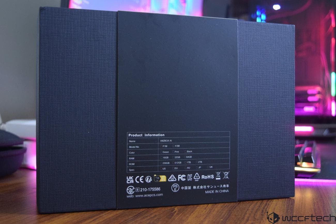 The ACEPC WizBox AI F1M Mini PC comes in a black cardboard package that has a very premium feel and has a flyer that covers the box with the WizBox AI branding and a picture of the product itself.