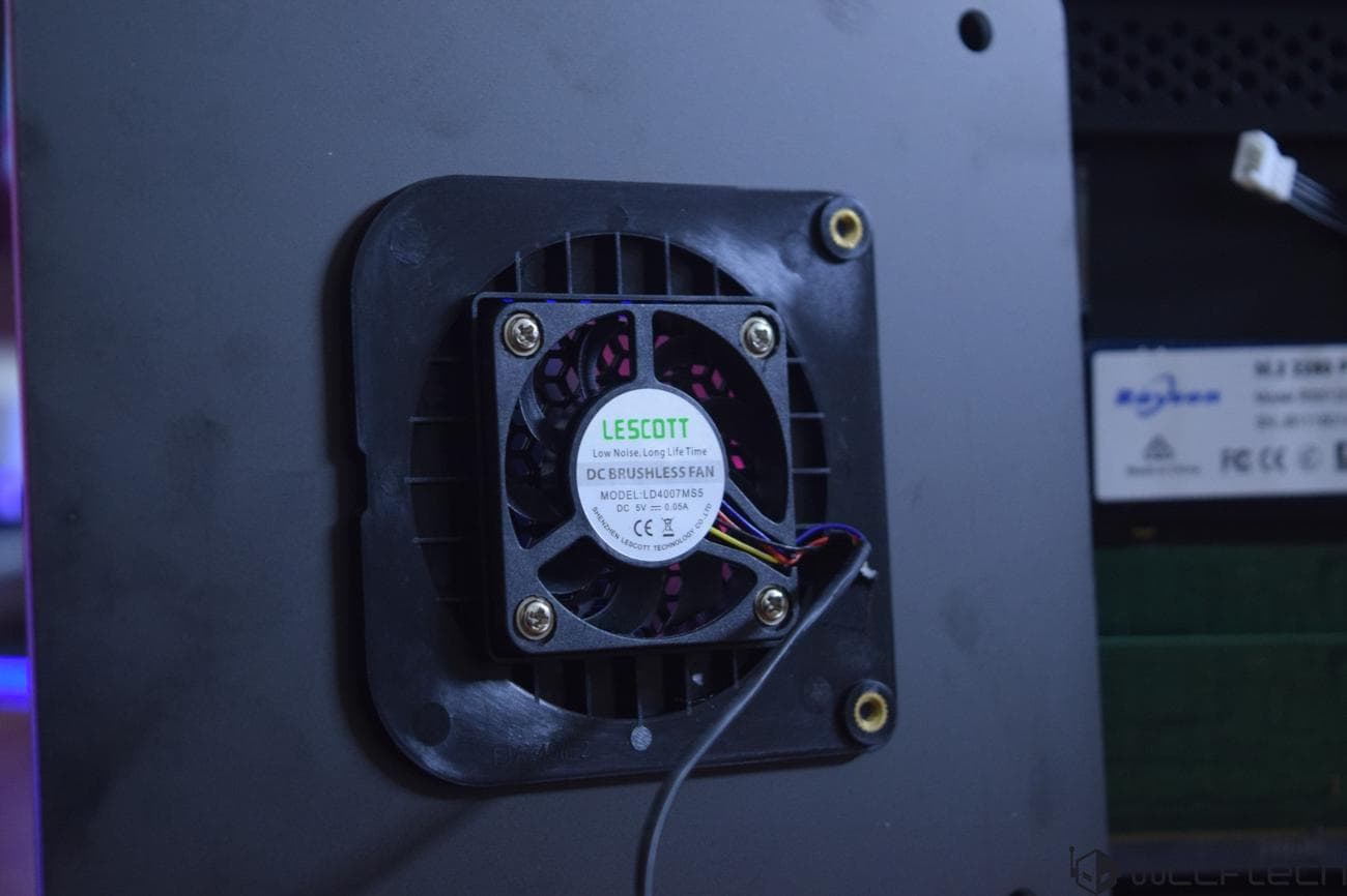 The first thing that you notice when removing the bottom cover is that there’s a single LESCOTT low-noise and long life time fan which features a brushless design and is rated at 0.05A (5V DC). This fan is used to push air from the bottom and into the chassis to keep the memory and SSD running cool.