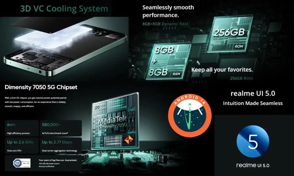 Το λογισμικό τρέχει στο Realme UI5.0 που βασίζεται στο Android 14, το οποίο πιθανότατα θα λάβει ενημερώσεις κώδικα ασφαλείας για τρία χρόνια και ενημερώσεις λειτουργικού συστήματος για δύο χρόνια. Το smartphone τροφοδοτείται από το chipset MediaTek Dimensity 7050 5G σε συνδυασμό με Mali-G68 GPU και 8 GB RAM εσωτερικής αποθήκευσης με έως και 256 GB αποθηκευτικού χώρου.