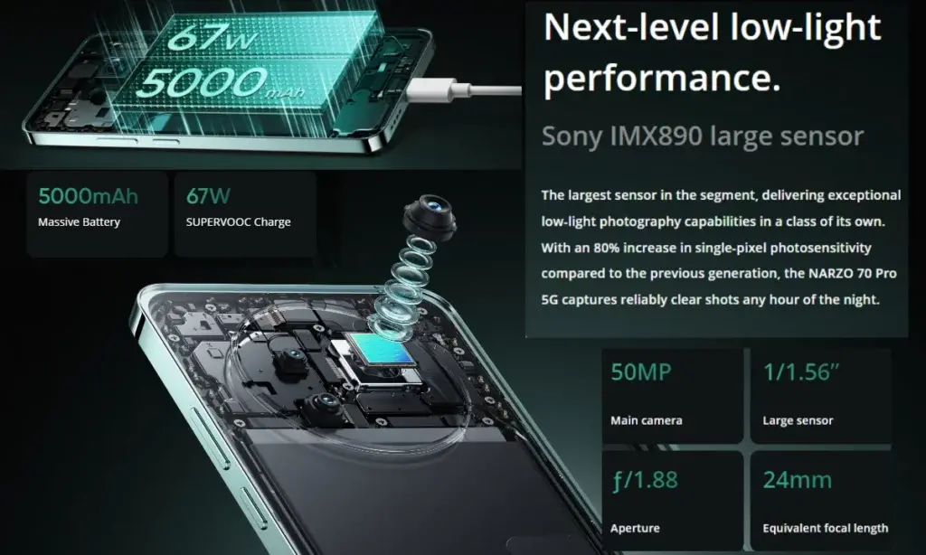 Επιπλέον, το Realme Narzo 70 Pro 5G διαθέτει έναν κύριο αισθητήρα Sony IMX890 50 MP, μια εξαιρετικά ευρεία κάμερα 8MP και αισθητήρες marco 2MP, ενώ περιλαμβάνεται μπροστινή κάμερα 16 MP για selfies. Μπαταρία AA 5000 mAh με τεχνολογία φόρτισης 67W SUPERVOOC χρησιμοποιήθηκε για την τροφοδοσία του smartphone για την τροφοδοσία του smartphone.