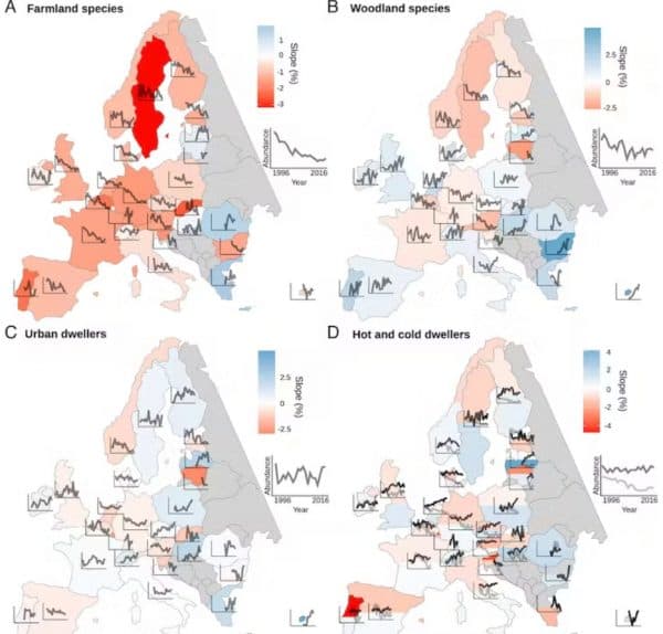 Μεταξύ 1980 και 2016, τα κοινά πουλιά στην Ευρώπη μειώθηκαν σε αφθονία κατά ένα τέταρτο. Αλλά ο αριθμός τους στις γεωργικές εκτάσεις μειώθηκε περισσότερο από το μισό κατά τη διάρκεια αυτής της περιόδου.