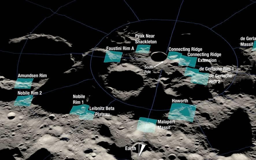 Αυτά ορισμένα σημεία που έχει επιλέξει στο Νότιο Πόλο της Σελήνης η NASA για να προσεδαφιστεί η αποστολή Artemis 3. Σε αυτά τα σημεία γίνονται τώρα μελέτες για να διαπιστωθεί αν διαθέτουν συνθήκες ικανές να συντηρούν κάποιες μορφές ζωής.