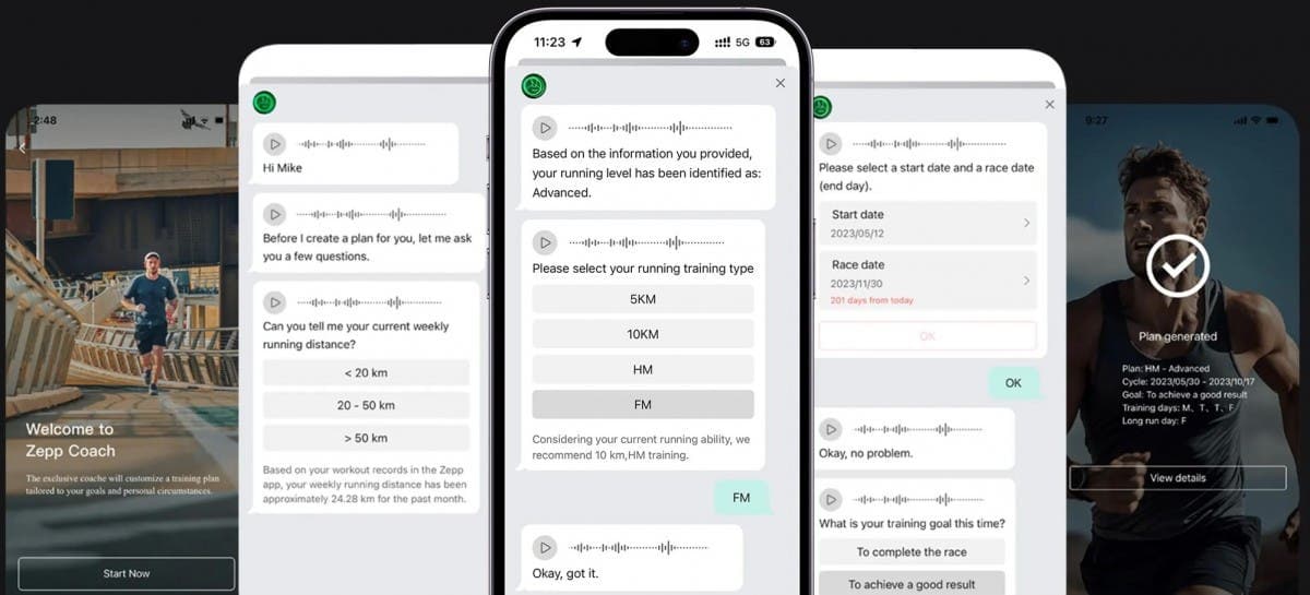 AI Chat για μια σύντομη επίδειξη προτού γίνει συνδρομητική υπηρεσία. Χρησιμοποιεί τεχνητή νοημοσύνη και εφαρμοσμένο μοντέλο μεγάλης γλώσσας (LLM) για να αναγνωρίζει τις περιγραφές φυσικής γλώσσας του χρήστη μέσω φωνητικών ή δακτυλογραφημένων εντολών για να παρέχει εύκολα κατανοητές απαντήσεις σε ερωτήσεις που σχετίζονται με τον αθλητισμό. Η Amazfit λέει, “Είναι ακριβώς σαν να βρίσκεσαι σε μια ατομική συνεδρία προπόνησης με έναν πραγματικό personal trainer.”