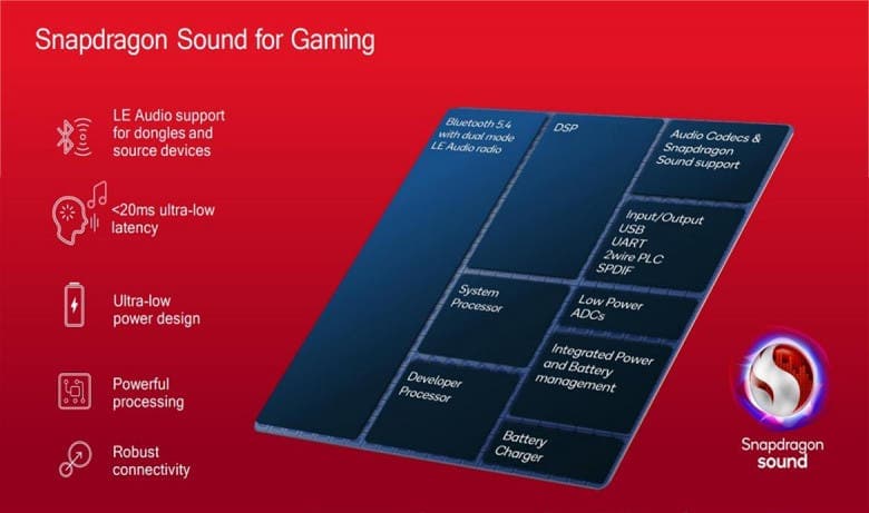 Η βελτιωμένη λύση έρχεται ειδικά για gaming, όπως αποκάλυψε το επίσημο δελτίο τύπου της εταιρείας. Είναι ένας συνδυασμός Snapdragon Sound και LE Audio. Παρέχει “εξαιρετικά χαμηλή καθυστέρηση ήχου, λιγότερο από 20ms”και μπορεί να μειωθεί ακόμη περισσότερο με τη συσκευή πηγής που παρέχει μόνο ήχο παιχνιδιού. Οι ακροατές μουσικής μπορούν να απολαύσουν ροή Bluetooth υψηλής ανάλυσης 24-bit 96 kHz, η οποία ενεργοποιείται μέσω της υποστήριξης του Snapdragon Sound και του ήχου aptX Adaptive.
