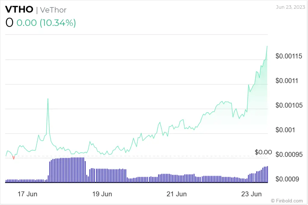 Κατά την σύνταξη του άρθρου η τιμή του VeThor διαμορφώθηκε στα 0,001175 $, σημειώνοντας κέρδη 10,24% την ημέρα, 22,80% σε όλη την προηγούμενη εβδομάδα, καθώς κινείται για να ανατρέψει την πτώση 2,05% από τον προηγούμενο μήνα, σύμφωνα με τις τελευταίες πληροφορίες ανακτήθηκε από την Finbold στις 23 Ιουνίου.