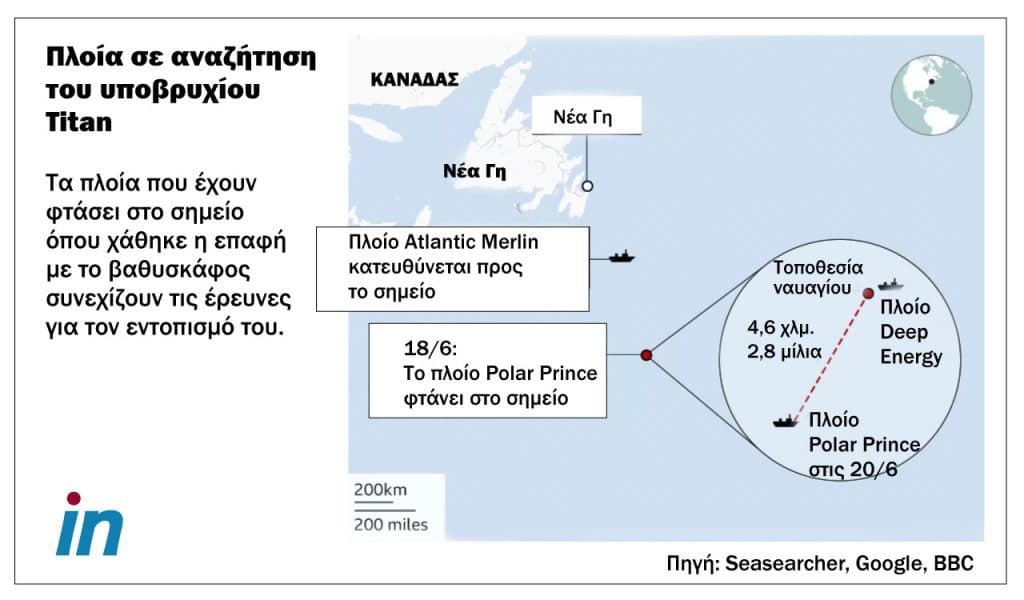 Η επαφή με το Titan χάθηκε περίπου 1 ώρα και 45 λεπτά μετά την έναρξη της καθόδου προς το ναυάγιο του Τιτανικού σε βάθος σχεδόν τεσσάρων χιλιομέτρων, περίπου 600 χιλιόμετρα έξω από τις ακτές της Νέας Γης στον Καναδά.