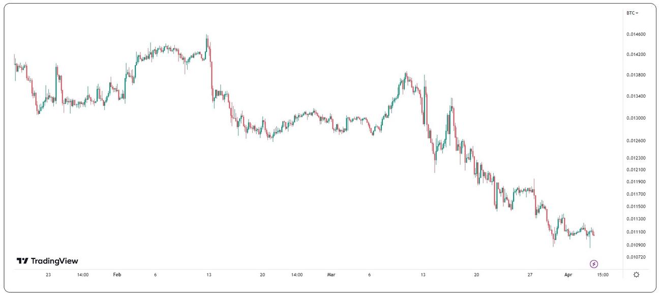 Ωστόσο, αν μεγεθύνουμε το διάγραμμα, το ανοίξουμε σε 4ωρο και συγκρίνουμε την πορεία του BNB με το Bitcoin, θα παρατηρήσουμε πως τις τελευταίες δύο εβδομάδες το νόμισμα της Binance βρίσκεται σε φθίνουσα πορεία,