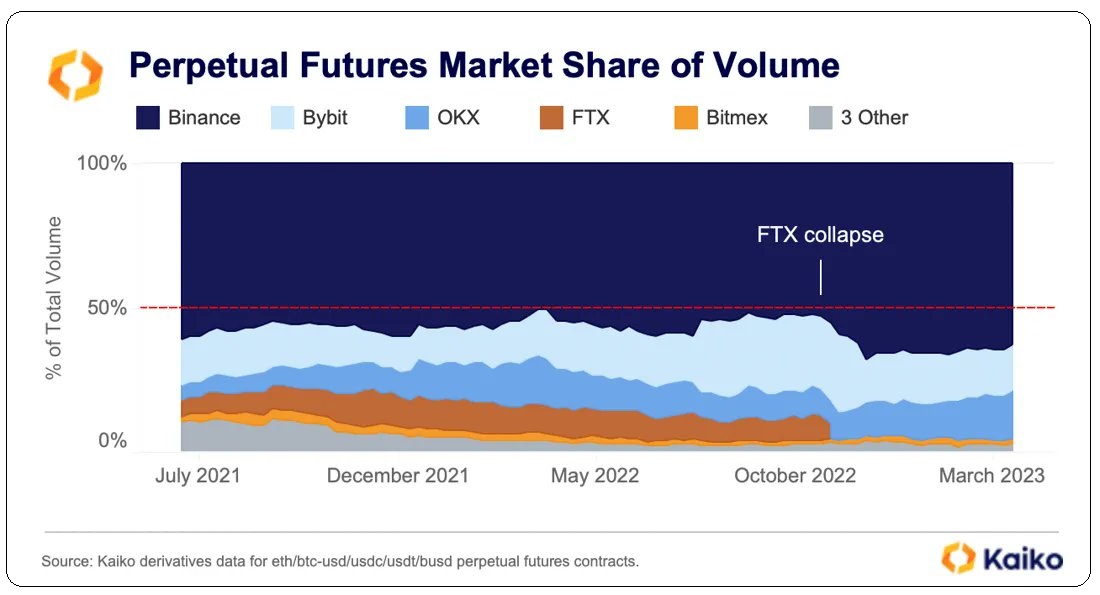Το συμπέρασμα φαίνεται λογικό, αν υπολογίσουμε ένα άλλο δεδομένο. Το μερίδιο αγοράς του όγκου παραγώγων της Binance είναι ως επί το πλείστον σταθερό. Υποχώρησε μόνο 2%. Η πλατφόρμα παραγώγων δεν είχε ποτέ μηδενικές προμήθειες. Κάτι που μας οδηγεί στο προφανές συμπέρασμα ότι ο αντίκτυπος της μήνυσης