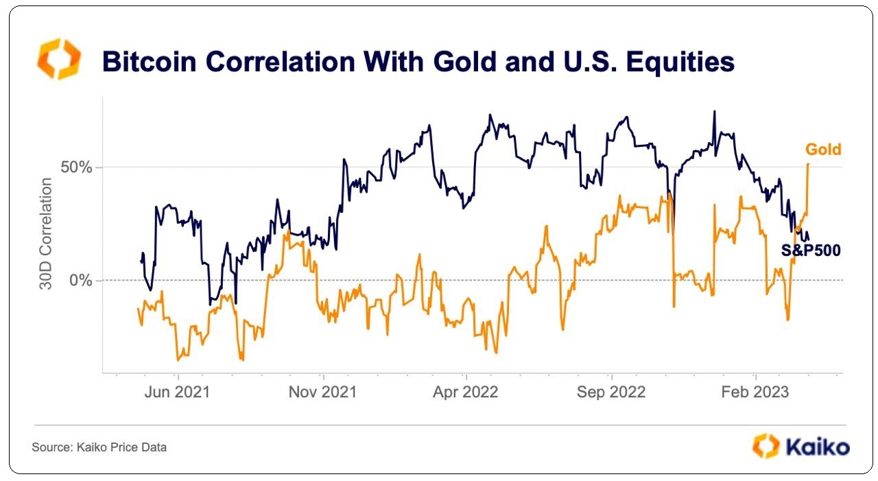 Τέλος, ένα άλλο στατιστικό δεδομένο που σίγουρα σχετίζεται με την πρόσφατη τραπεζική κρίση και αντλήσαμε από την Kaiko είναι πως η συσχέτιση του Bitcoin με τον χρυσό