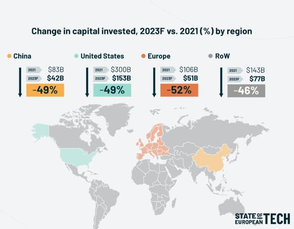 Αν και ο όγκος των επενδύσεων της Ευρώπης έχει μειωθεί σημαντικά, είναι σημαντικό να σημειωθεί ότι αυτή η χρηματοδοτική ανομβρία δεν είναι ενδημικό φαινόμενο της Ευρώπης, αλλά μια παγκόσμια τάση. Για την ακρίβεια, τόσο στις ΗΠΑ, όσο και στην Κίνα, αλλά και στον υπόλοιπο κόσμο, τα οικοσυστήματα καινοτομίας θα δουν φέτος μείωση της χρηματοδότησης κατά 50% έναντι της χρονιάς-ρεκόρ (σσ το 2021).