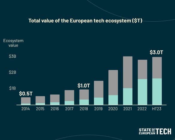 Να σημειωθεί ότι, παρά τη μείωση τόσο των χρηματοδοτήσεων όσο και των αποτιμήσεων, η αξία των ευρωπαϊκών startups παραμένει σε υψηλά επίπεδα, υπερβαίνοντας τα 3 τρισ. δολ., με το σχετικό μέγεθος να έχει αυξηθεί κατά 2 τρισ.δολ. μόνο την τελευταία 6ετία.