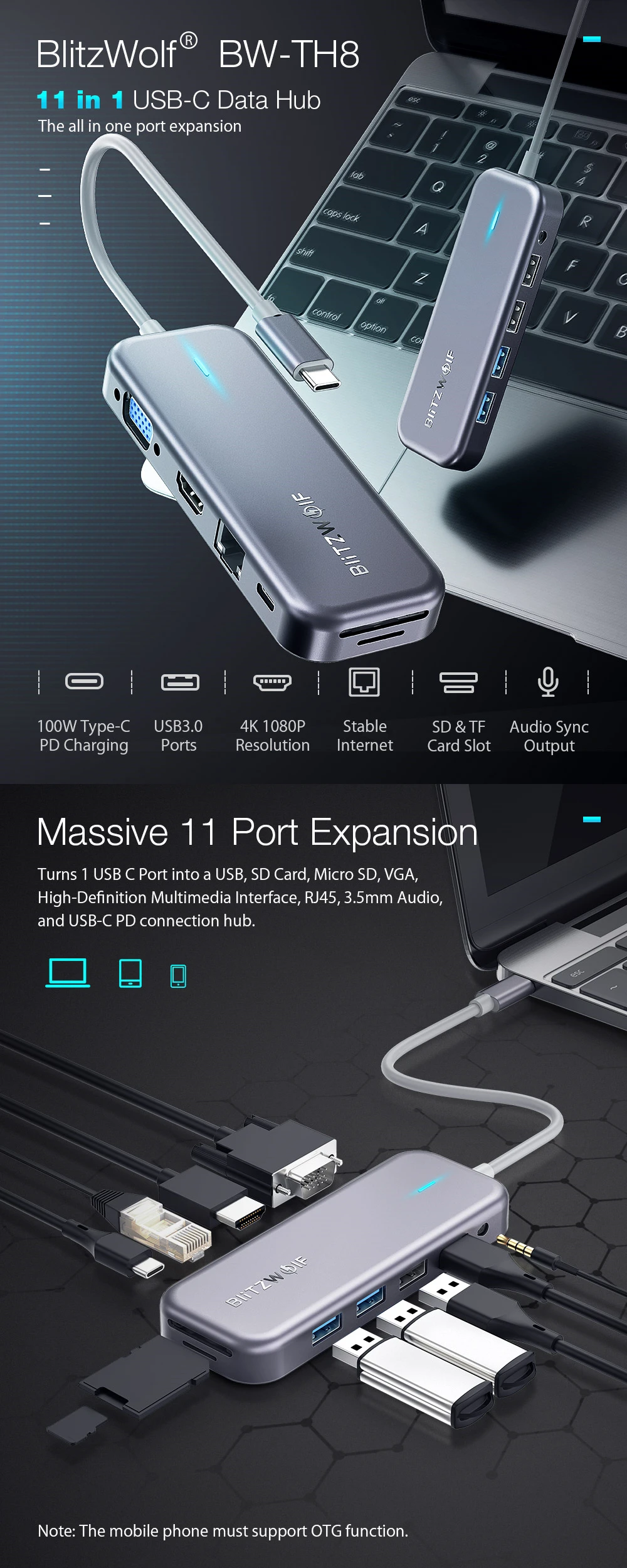 BlitzWolf BW-TH8 : USB-C Hub 11-σε-1, με USB/HDMI/VGA και Ethernet θύρες, αλλα και τροφοδοσία με μέχρι και 100W.