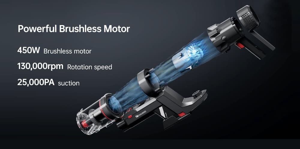 Το μοτέρ της, που φτάνει τα 450W και προσφέρει απορρόφηση 25kpa, αλλα και το σύστημα φίλτρων, είναι κολλημένα στη λαβή, ενώ εκεί θα βρείτε και τη μπαταρία, οπότε όλο το βάρος είναι ψηλά, που είναι πολύ καλή απόφαση για μια σκούπα που θα ακουμπάει συνέχεια στα ροδάκια της.