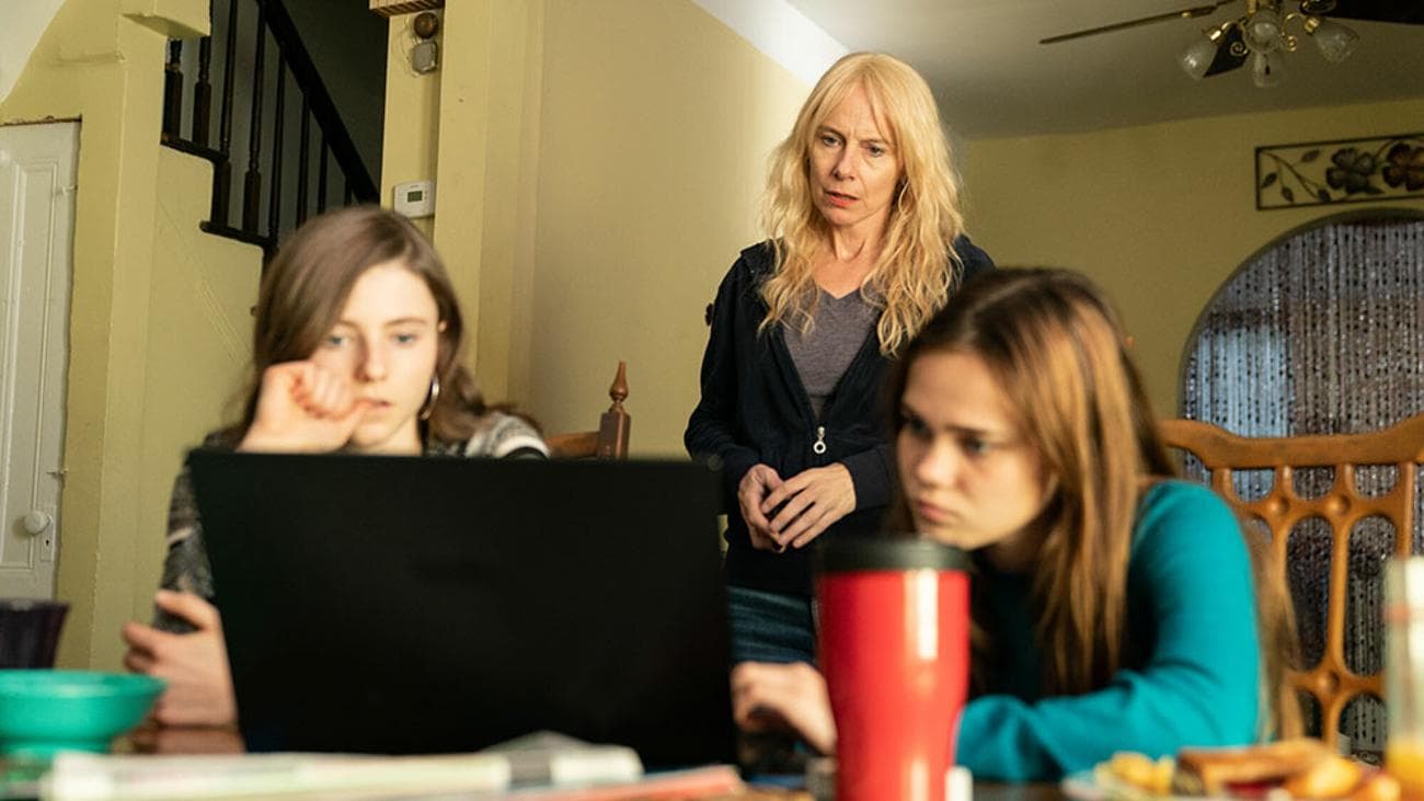 Storm Reid and Megan Suri look worried reading a computer screen in the film