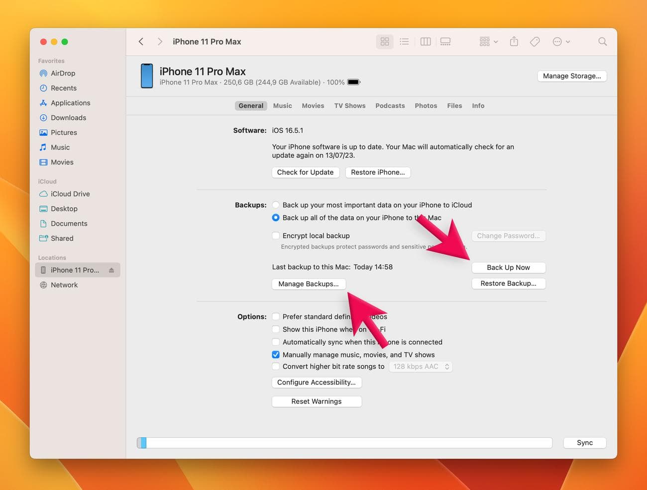 - Κάντε κλικ στο κουμπί Διαχείριση αντιγράφων ασφαλείας.