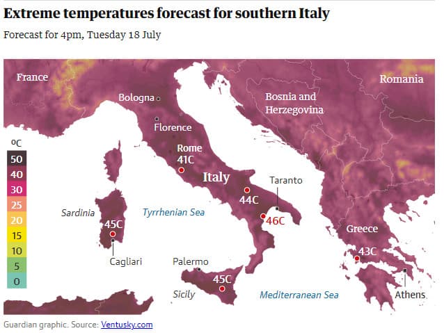 , σε 16 πόλεις στην Ιταλία έχει σημάνει κόκκινος συναγερμός. Η Ρώμη, η Φλωρεντία, η Μπολόνια είναι ανάμεσα στις περιοχές που έχουν επηρεαστεί από τον καύσωνα, με τους μετεωρολόγους να προβλέπουν ότι στη Σικελία και τη Σαρδηνία οι θερμοκρασίες μπορεί σκαρφαλώσουν στους 49 βαθμούς Κελσίου, κάτι που θα σπάσει κάθε ρεκόρ στην Ευρώπη.
