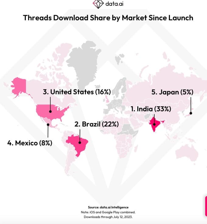 Η εταιρεία διαπίστωσε επίσης ότι η Ινδία, όχι οι ΗΠΑ, προηγείται όσον αφορά τις λήψεις της νέας εφαρμογής, αντιπροσωπεύοντας το 33% των παγκόσμιων λήψεων. Ακολουθεί η Βραζιλία (22%), μετά οι ΗΠΑ (16%) και τέλος το Μεξικό και η Ιαπωνία, με 8% και 5%, αντίστοιχα. Ωστόσο, τα νήματα δεν είναι διαθέσιμα στην ΕΕ αυτήν τη στιγμή λόγω ρυθμιστικών εμποδίων που σχετίζονται με ανησυχίες σχετικά με το απόρρητο και τις πρακτικές συλλογής δεδομένων. Η
