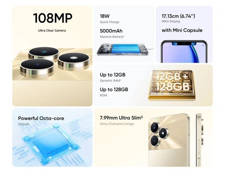 Όπως έδειξαν οι πρώτες λεπτομέρειες, το νέο C53 διαθέτει κύρια κάμερα 108MP, αντικαθιστώντας την κάμερα 50MP του αρχικού C53. Ακόμη και το C55 έχει μόνο μια κύρια κάμερα 64MP. Η επιπλέον ανάλυση δίνει στο νέο τηλέφωνο 3x zoom. Όπως και στο C55, δεν υπάρχει κάμερα υπερευρείας γωνίας. Ωστόσο, υπάρχει μια selfie κάμερα 8MP, σε αυτό που η Realme αποκαλεί «μίνι κάψουλα» – η άποψη της εταιρείας για το Dynamic Island UI. Σημειώστε ότι αυτό βρίσκεται σε μια εγκοπή και όχι σε μια οπή. Το παλιό C53 και το νέο C53 έχουν μπαταρίες 5.000 mAh. Ωστόσο, αυτό έχει πιο αργή φόρτιση στα 18W, από 33W. Τα υπόλοιπα είναι σχεδόν πανομοιότυπα με αυτά που είδαμε τον Μάιο.