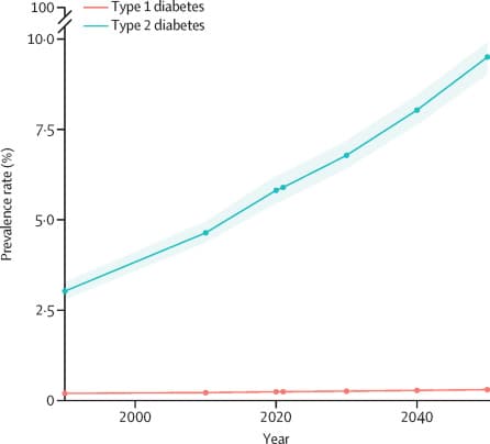 Η τεράστια πλειοψηφία των περιπτώσεων διαβήτη μέσα στις επόμενες τρεις δεκαετίας αναμένεται να είναι Τύπου 2, κυρίως λόγω του γηράσκοντα πληθυσμού και την αύξηση της παχυσαρκίας. Οι άνθρωποι που ζουν με διαβήτη έχουν αυξημένο κίνδυνο ανάπτυξης άλλων ασθενειών και θανάτου από ανακοπή και εγκεφαλικό, ενώ προκαλεί και επιπλοκές όπως απώλεια όρασης και έλκη στα πόδια.