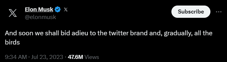 Από την εξαγορά του Twitter από τον Μασκ για 44 δισεκατομμύρια δολάρια, έχουν πραγματοποιηθεί σημαντικές αλλαγές. Αναμόρφωσε την ηγετική ομάδα, διέλυσε το διοικητικό συμβούλιο και μείωσε δραστικά το εργατικό δυναμικό. Αυτές οι κινήσεις, μαζί με τις αμφιλεγόμενες απόψεις του Μασκ για την ελευθερία του λόγου, οδήγησαν σε αξιοσημείωτη μείωση των διαφημιστικών εσόδων. Ο Μασκ εργάζεται ενεργά για την αύξηση των εσόδων από συνδρομές μέσω του Twitter Blue, μιας υπηρεσίας επί πληρωμή που προσφέρει προνόμια όπως ένα «επαληθευμένο» μπλε σημάδι ελέγχου, που προηγουμένως ήταν διαθέσιμο μόνο σε διασημότητες. Επιπλέον, η εταιρεία άρχισε να μοιράζεται τα έσοδα από διαφημίσεις με ορισμένους δημιουργούς, καθιστώντας τους συνδρομητές Twitter Blue κατάλληλους για πληρωμές. Με αυτό το rebranding, το Twitter σηματοδοτεί μια σαφή απομάκρυνση από την προηγούμενη ταυτότητά του, αγκαλιάζοντας μια νέα εποχή υπό την ηγεσία του Μασκ.