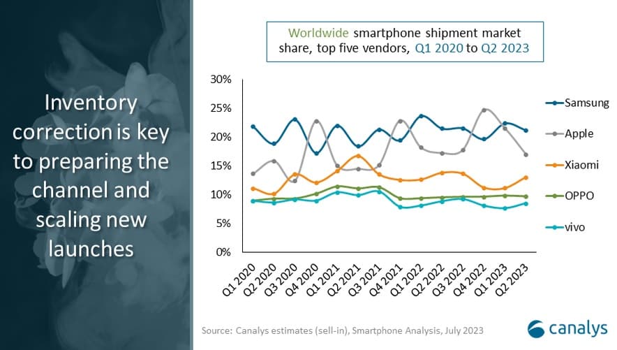 Σύμφωνα με τα στοιχεία της εταιρείας ερευνών Canalys, η Samsung διατήρησε την ηγετική θέση με μερίδιο αγοράς 21%, ενώ η Apple κράτησε τη δεύτερη θέση με μερίδιο αγοράς 17%. Ωστόσο, εκτός των δύο πρώτων, η μείωση των αποστολών smartphone αποκαλύπτει σημάδια βελτίωσης, καθώς τα αποθέματα των περισσότερων προμηθευτών επιστρέφουν σε υγιέστερα επίπεδα, ενώ οι μακροοικονομικές συνθήκες σταθεροποιούνται.