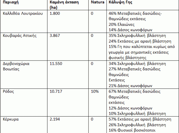 Στον παρακάτω Πίνακα 2 παρουσιάζονται οι καμένες εκτάσεις, όπως προέκυψαν από τη χαρτογράφηση κατά τη διάρκεια ή και μετά τη λήξη των πυρκαγιών.