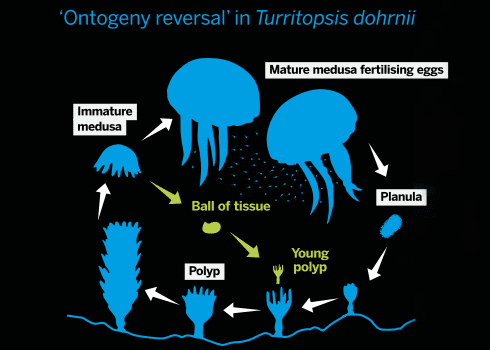 και όταν γερνάει ή τραυματίζεται, μπορεί να ξεγελάσει το θάνατο επιστρέφοντας σε μορφή πολύποδα. Αυτό το πετυχαίνει απορροφώντας τα πλοκάμια της καθώς βυθίζεται στον πυθμένα ως μία μάζα αδιαφοροποίητων κυττάρων. Από εκεί, ο πολύποδας αναπτύσσεται ξανά παράγοντας μία νέα ενήλικη μορφή, γενετικά πανομοιότυπη με την προηγούμενη.