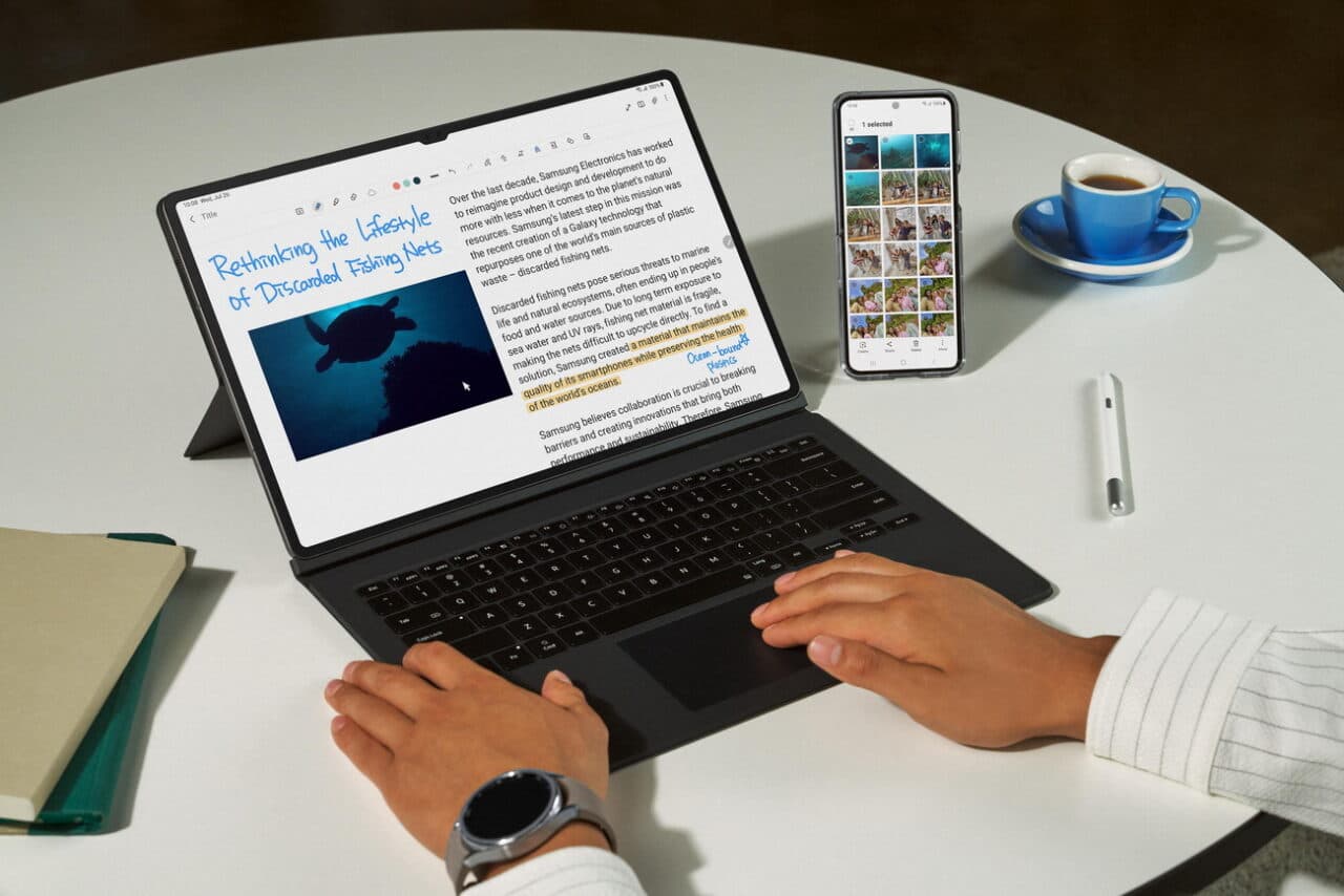 Με την ξεχωριστή εμπειρία συσκευής που προσφέρει, η σειρά Galaxy Tab S9 ενσωματώνεται άψογα στο οικοσύστημα Galaxy. Η χρήση των δημιουργικών εργαλείων είναι απλή, ειδικά όταν τα tablet Galaxy Tab S9 είναι συνδεδεμένα με άλλες συσκευές. Το Multi-Control κάνει την αντιγραφή, την επικόλληση ή τη μεταφορά κειμένου και εικόνας απευθείας από το tablet στο Galaxy smartphone απρόσκοπτη, επιτρέποντας στους χρήστες να ελέγχουν το smartphone τους με ένα touchpad Galaxy Tab S9.