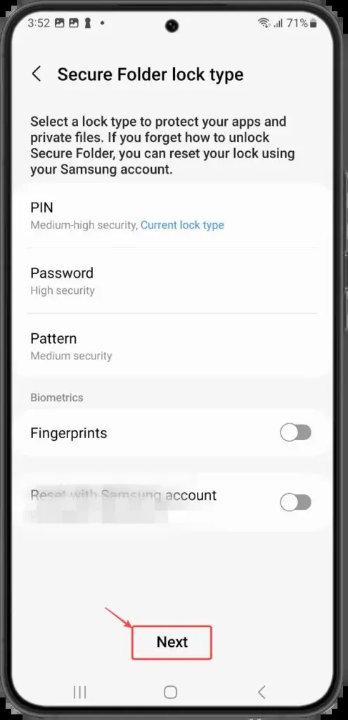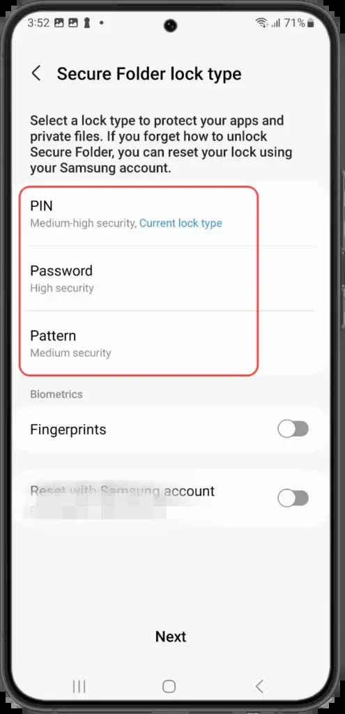 - Επιλέξτε τον τύπο κλειδώματος για να προστατεύσετε τις εφαρμογές και τα αρχεία σας από PIN, κωδικό πρόσβασης, μοτίβο ή δακτυλικό αποτύπωμα.