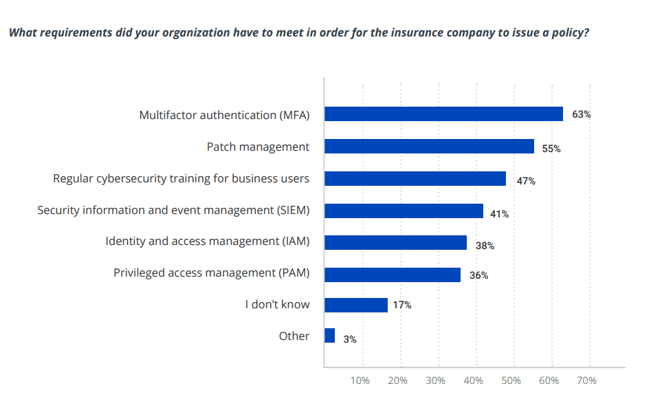 αποκαλύπτει χρήσιμες λεπτομέρειες σχετικά με τη διαδικασία απόκτησης των προκριματικών για την ασφάλεια στον κυβερνοχώρο σήμερα. Διαπίστωσε ότι το 50% των οργανισμών με ασφάλιση στον κυβερνοχώρο εφάρμοσαν πρόσθετα μέτρα ασφαλείας είτε για να ανταποκριθούν στις απαιτήσεις του ασφαλιστηρίου που επέλεξαν είτε για να είναι απλώς επιλέξιμοι για ένα ασφαλιστήριο συμβόλαιο. Το παρακάτω σχήμα δείχνει τις συγκεκριμένες απαιτήσεις που ανέφεραν ότι έπρεπε να πληρούν: