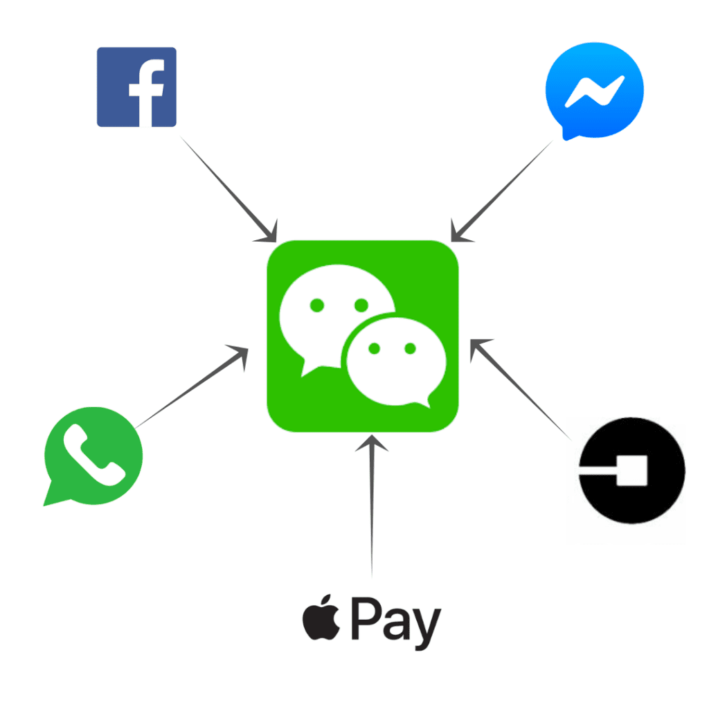 Το WeChat κυκλοφόρησε το 2011 από τον τεχνολογικό γίγαντα Tencent και χρησιμοποιείται σήμερα από το σύνολο του πληθυσμού της Κίνας. Πρόκειται για μία υπερ-εφαρμογή, με τις υπηρεσίες της να περιλαμβάνουν μηνύματα, ηχητικές και βίντεο κλήσεις, social media, παραγγελίες φαγητού, πληρωμές, παιχνίδια, νέα και dating. Είναι σαν να συνδυάζει κανείς το WhatsApp, το Facebook, το Apple Pay, το Uber, το Amazon και το Tinder, όλα σε μία εφαρμογή.