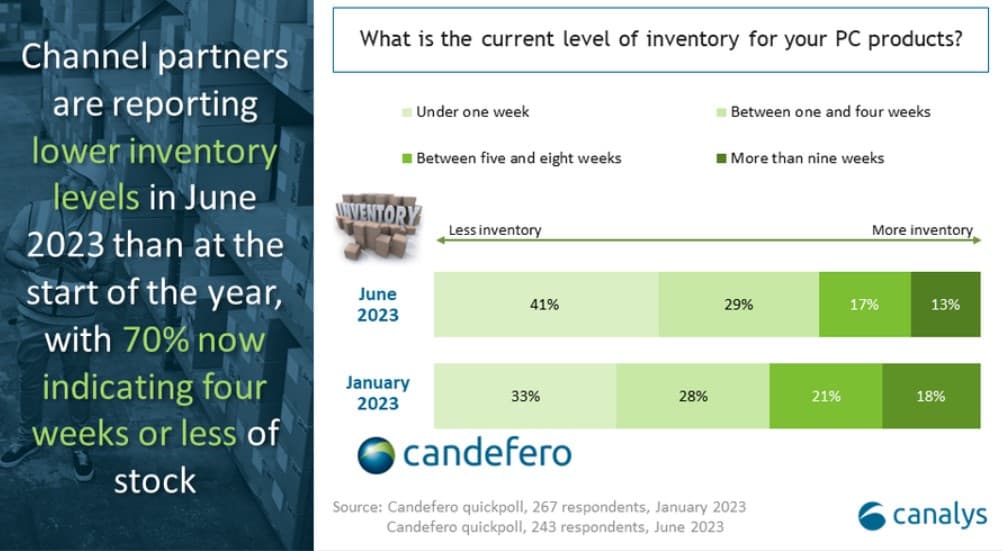«Τα θετικά μηνύματα της αγοράς μας κάνουν αισιόδοξους για περαιτέρω βελτίωση στον κλάδο των υπολογιστών το 2023. Τα επίπεδα των αποθεμάτων μειώθηκαν περαιτέρω το δεύτερο τρίμηνο, καθώς το 41% των συνεργατών καναλιών, που συμμετείχαν σε έρευνα από την Canalys τον Ιούνιο, ανέφερε αποθέματα μικρότερα της μιας εβδομάδας» τονίζει η Canalys.