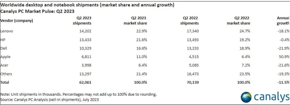 συνέχισε να ηγείται της παγκόσμιας αγοράς υπολογιστών, αλλά υπέστη μεγάλη πτώση πωλήσεων, της τάξης του 18%, σε ετήσια βάση, το δεύτερο εξάμηνο του 2023, με τις πωλήσεις να μειώνονται στα 14,2 εκατ. μονάδες.