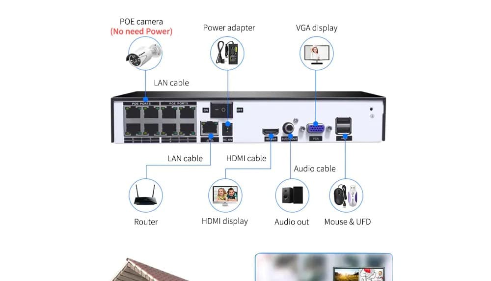 Έχει HDMI και VGA έξοδο για σύνδεση σε οθόνη, και ethernet θύρα για να το συνδέσετε στο μόντεμ, ώστε να έχετε απομακρυσμένη πρόσβαση στις καταγραφές του.
