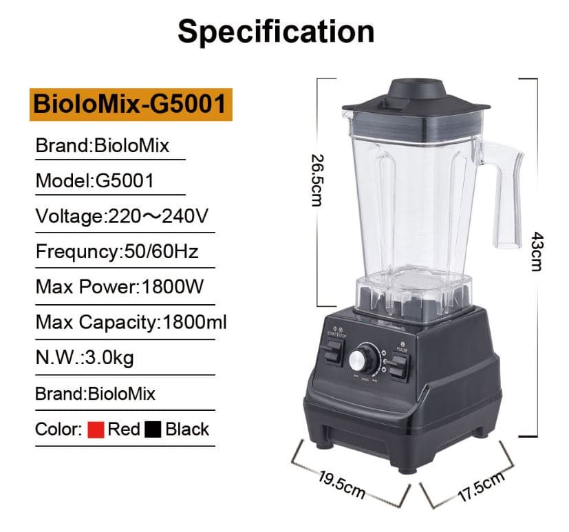 Το πακέτο περιλαμβάνει τη βάση τροφοδοσίας, ένα μεγάλο βάζο 1800ml, ένα επιπλέον μικρό βάζο 600ml και ένα αγγλικό εγχειρίδιο χρήσης. Το μικρό βάζο είναι ένα δωρεάν δώρο από την BioloMix, αυξάνοντας περαιτέρω την αξία αυτού του μίξερ.