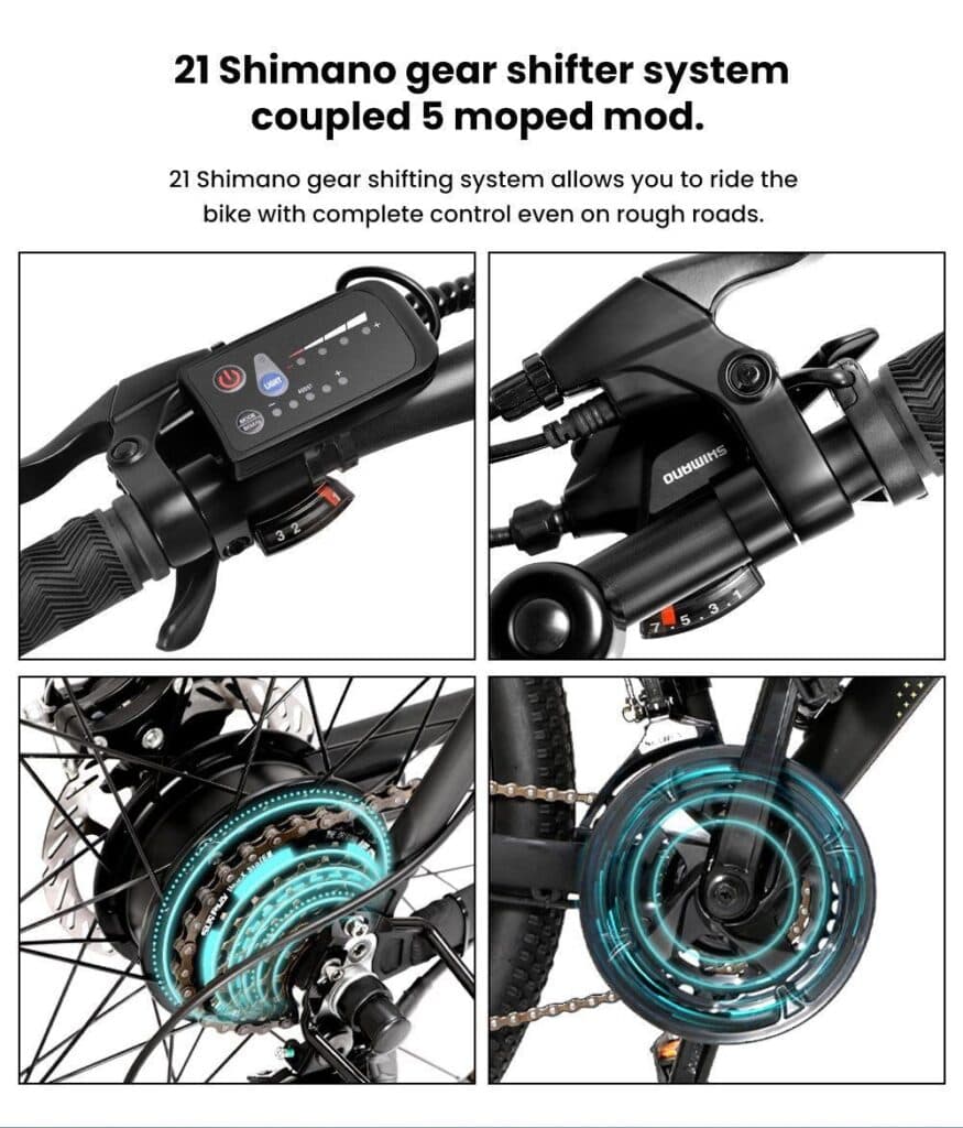 To Eleglide M1 εχει Brushless μοτέρ 250W και σύστημα ταχυτήτων της Shimano, με 21 ταχύτητες.