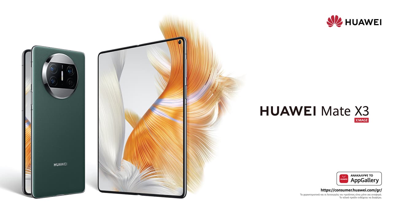 Το νέο HUAWEI Mate X3 ανοίγει το δρόμο για μια νέα εποχή foldable smartphones, κατηγορία στην οποία η Huawei είναι παγκόσμιος τεχνολογικός ηγέτης. Πρόκειται για ένα κορυφαίο smartphone, που θέτει νέα πρότυπα για το πόσο ελαφρύ, λεπτό και αξιόπιστο μπορεί να είναι ένα foldable. Το HUAWEI Mate X3 είναι το λεπτότερο και ελαφρύτερο αναδιπλούμενο smartphone με μεγάλη οθόνη στον κόσμο και έχει αναβαθμιστεί σε όλα τα μέτωπα – όπως οι εσωτερικές και εξωτερικές οθόνες, το σύστημα αναδίπλωσης νέας γενιάς και το σύστημα απεικόνισης.