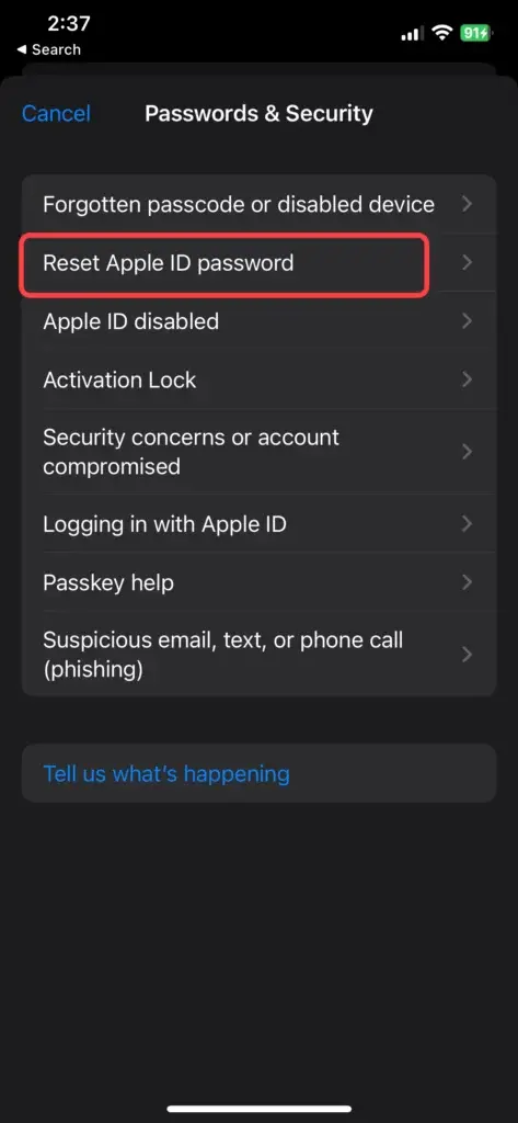 - Επιλέξτε Επαναφορά κωδικού πρόσβασης Apple id και πατήστε Έναρξη.