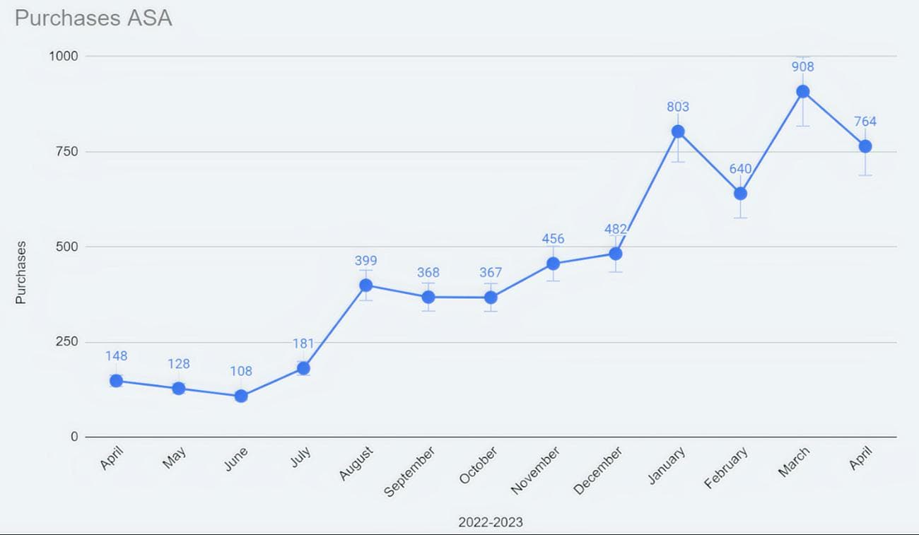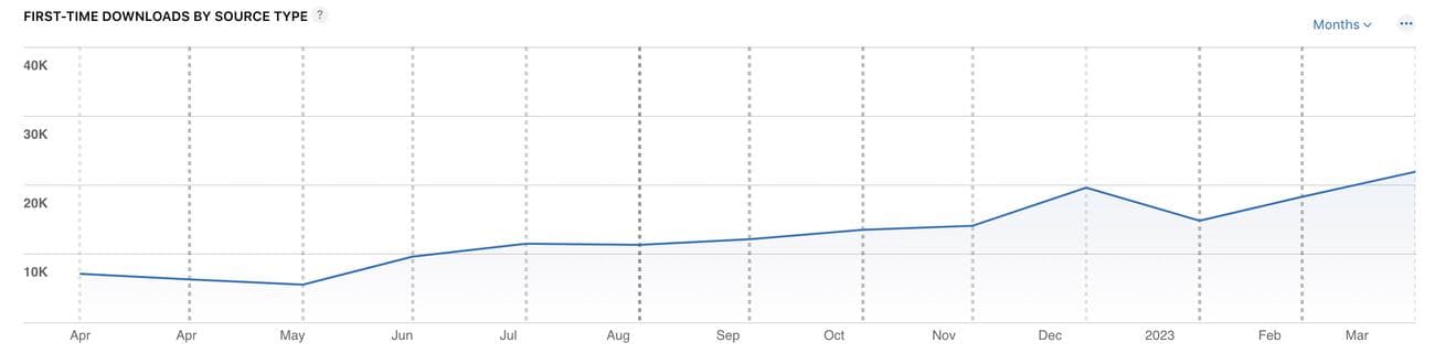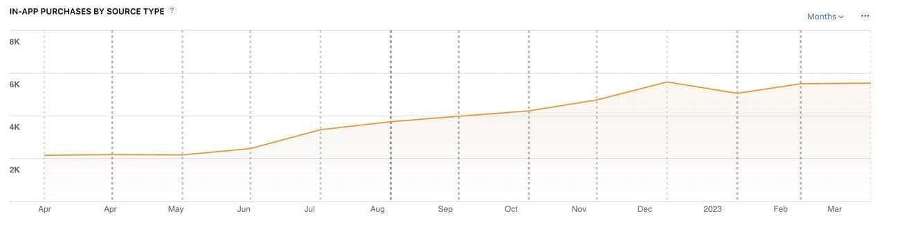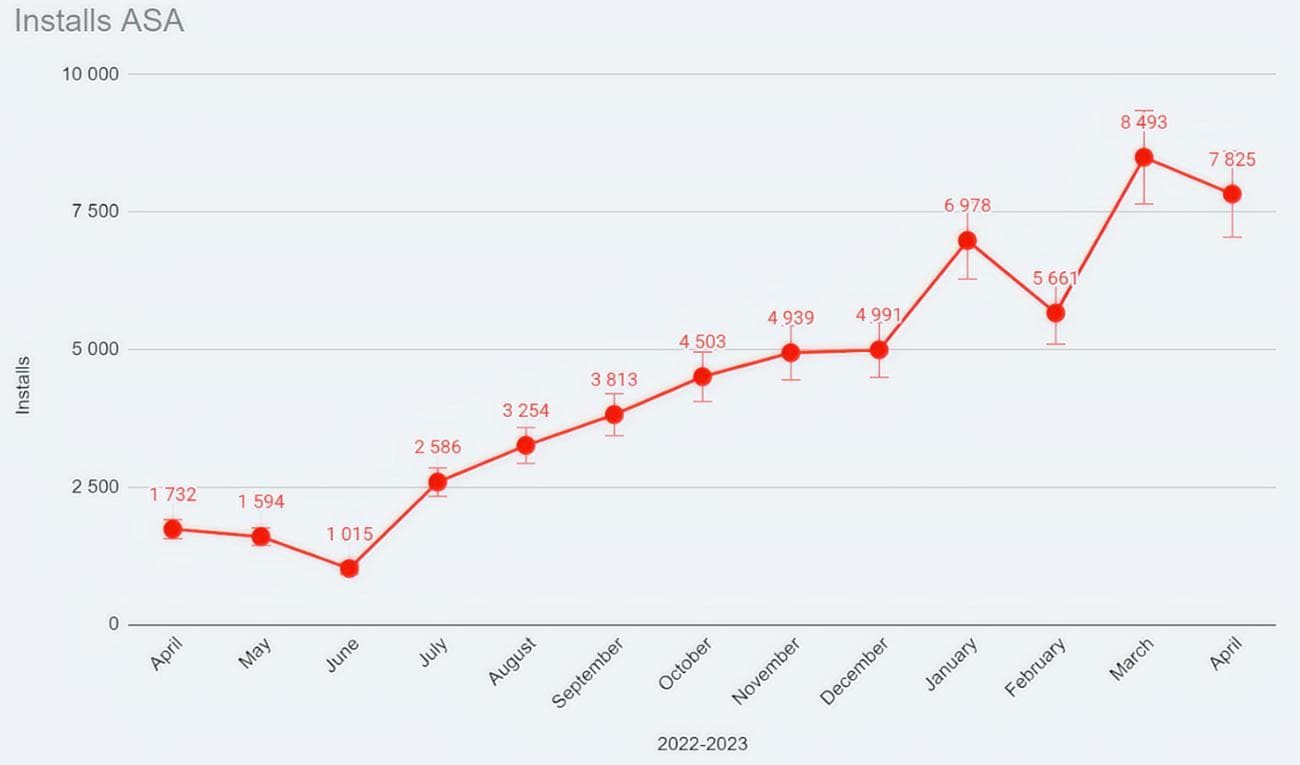 Δυναμική λήψεων και αγορών από το Apple Search Ads κατά τη διάρκεια του έτους (Απρίλιος 2022 – Απρίλιος 2023).